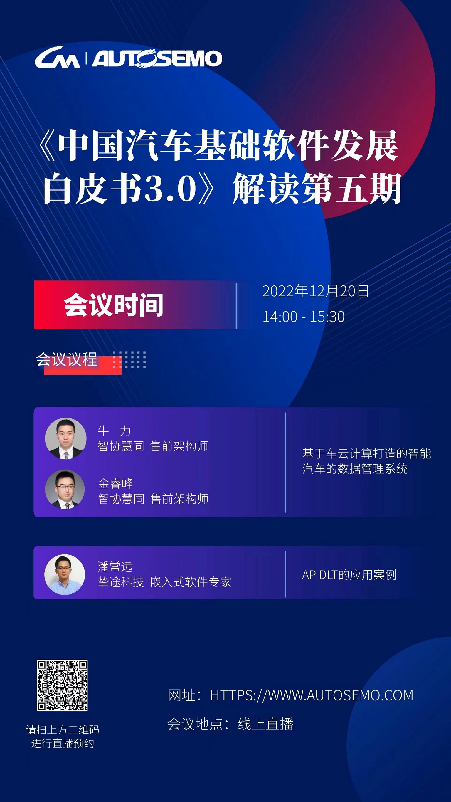 2022年12月20日14:00-15:30,受AUTOSEMO邀请,智协慧同将直播解读《中国汽车基础软件发展白皮书3.0》相关章节。