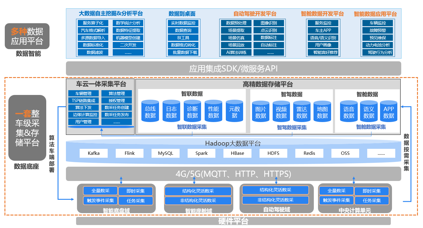 基于智协慧同车云一体的软件中间件方案,主机厂只需打造一套采集&存储系统就能实现整车级的数据采集和管理,上层满足多种数据应用平台的搭建,整体建设方案如下: