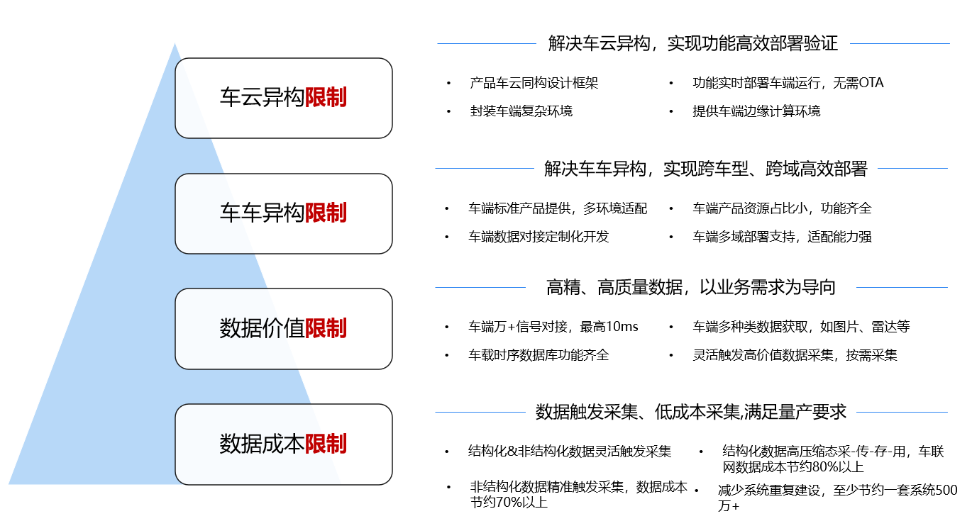 3、传统的智驾数采方案与数据应用强耦合:自动驾驶领域专业性强,更多是采集图片、雷达等非结构化数据,由于数据量巨大,需要基于场景触发精准采集,现有传统的智驾数采方案场景的定义需要写大量代码且对专业部门的经验依赖较强,导致采集系统和应用系统不解耦,现有车联网数据团队能力无法覆盖,自然而然自动驾驶数采系统也就另起炉灶,划给自动驾驶部门。