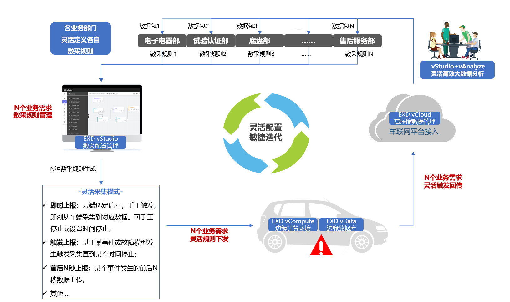 3.整套数采系统灵活高效:以业务为导向,满足业务部门的专业需求,结构化总线数据最高支持10ms的数采周期;边缘计算支持智驾部门快速定义触发场景,高效获取所需场景的多类型数据,用于算法的快速迭代及仿真场景库的搭建;整套车云协同的方案,支持触发算法一键下发车端,无需繁杂的OTA流程,算法迭代效率高,完全满足车联网和自动驾驶对数据灵活性、高效迭代的要求;
