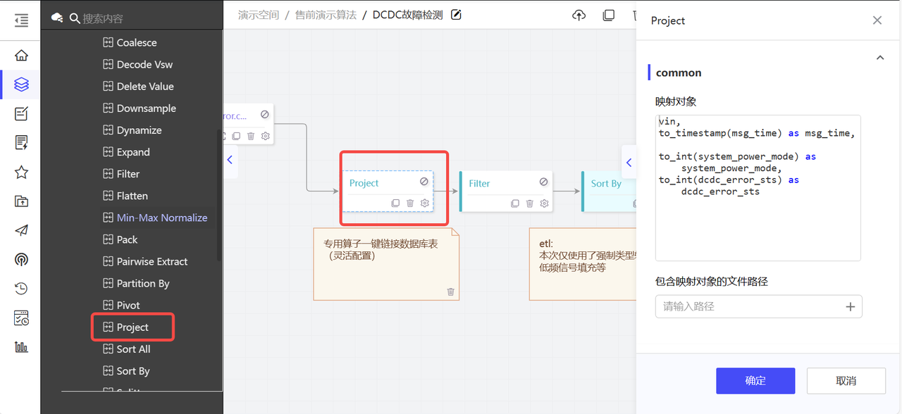 数据类型转换,选择project算子,将初始的string类型转换为对应的数据类型。