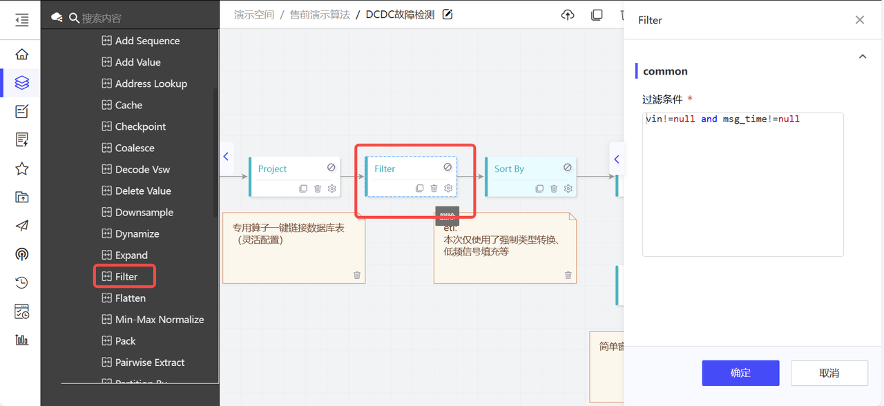 过滤异常值,选择filter算子,将vin和msg_time不为null的数据保留下来,null值过滤掉。