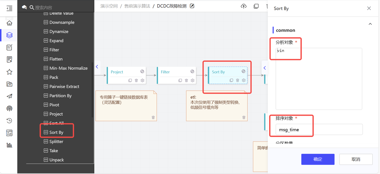 排序,选择sortby算子,将数据按照vin进行分组,然后按照msg_time进行排序。