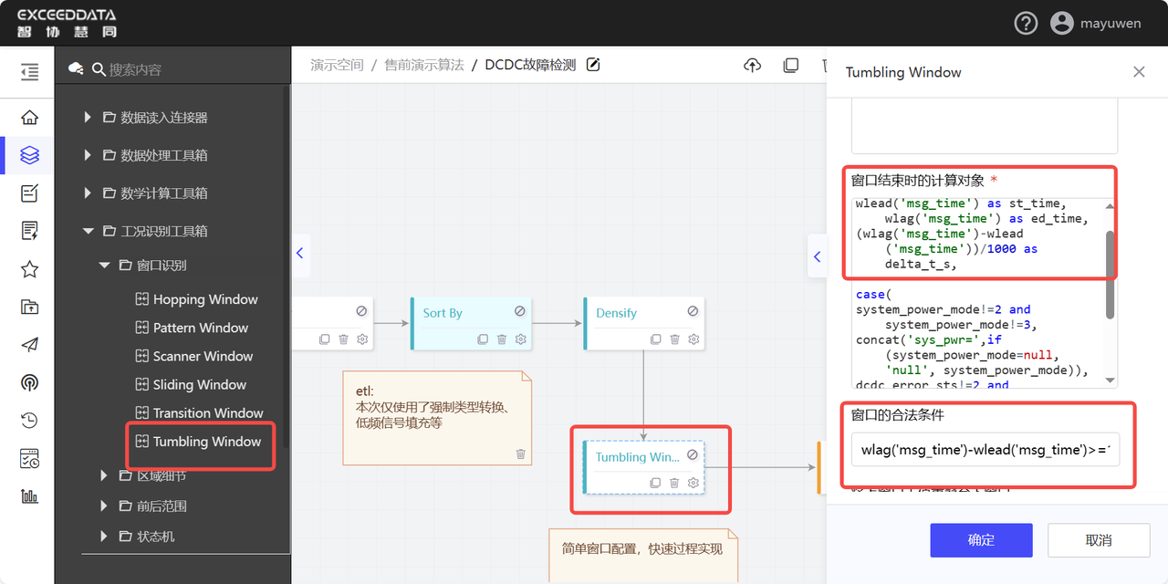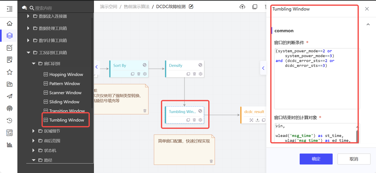 选择Tumbling Window算子,工况识别逻辑编写,电源模式为2或者3同时dcdc状态为2或者3,同时该状况持续时间达到10s以上。
