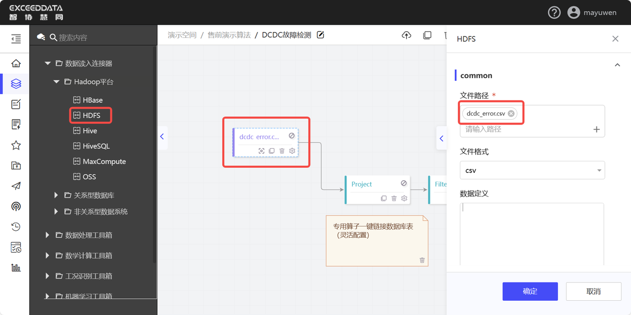将数据进行导入,拖拽HDFS数据连接器,选择需要的数据文件。