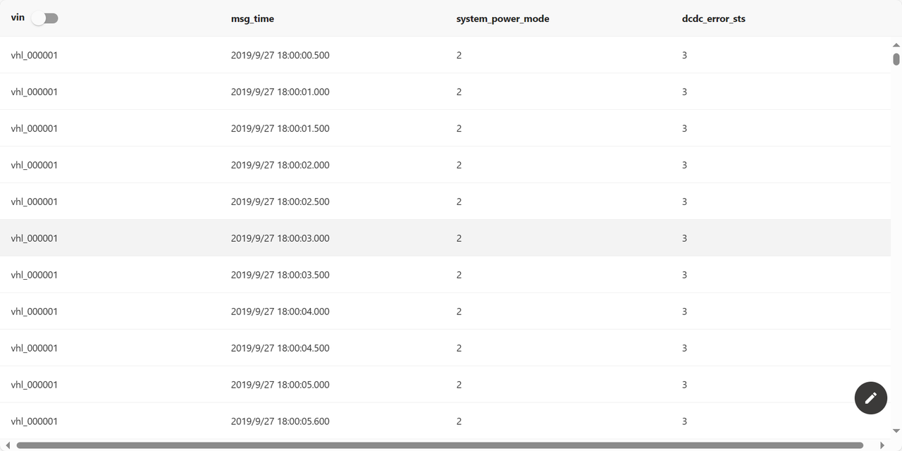 vin为vhl_000001的车发生了两次DCDC故障,第一次开始时间为18:00:00.5,结束时间为18:00:18,总持续时间为17.5s;第二次开始时间为18:01:53.1,结束时间为18:02:16.7,总持续时间为23.6s 。