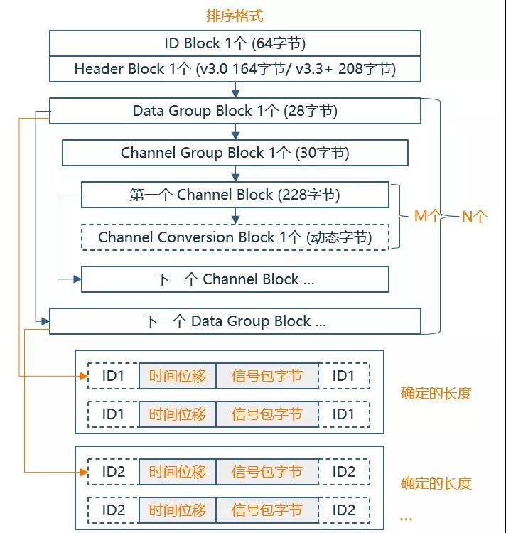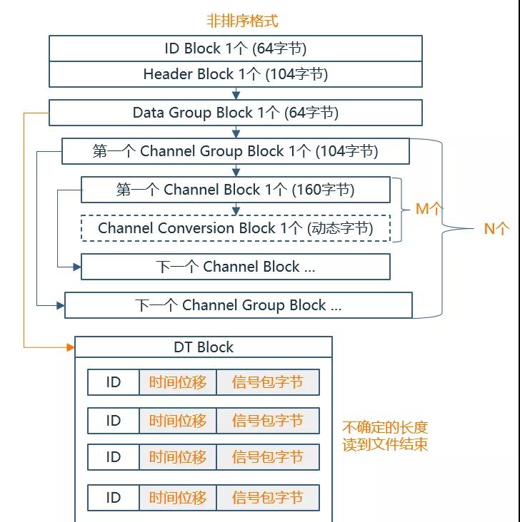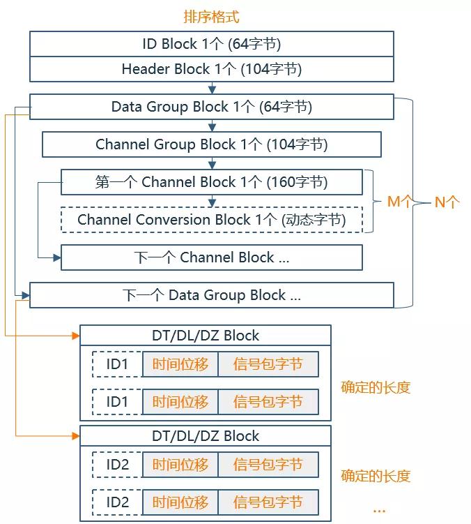 - Data Group Block(1个以上)数据组:包括这个数据组内的信号组数量、数据的行数、一行数据的长度,数据前或后带ID的长度、第一个信号组定义的位置指针、下一个数据组块定义的位置指针、数据的位置指针等