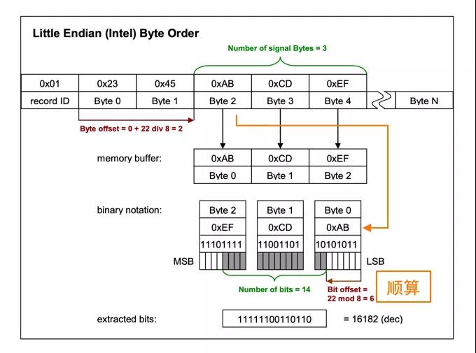 整数编码1、字节位移(顺算) - ID byte # + bit 位移/ 82、总字节长度 - (Bit长度 + bit 位移)/ 8 round up3、Bit位移(顺算) - bit 位移%84、最后一位的bit为高位(可能需要sign判断)