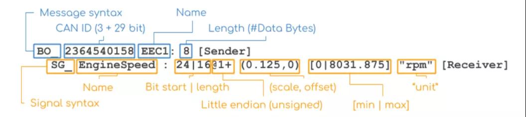 SG_ EngineSpeed : 25|9@0+ (0.1,0) [min|max] "unit" Vector_XXX