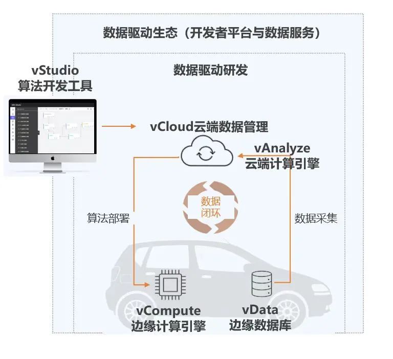 vAnalyze和vCompute分别为云端和车端计算引擎,vStudio开发的算法无需重新编译,可秒级部署到车端,通过流计算对车端毫秒级的原始信号进行实时计算。