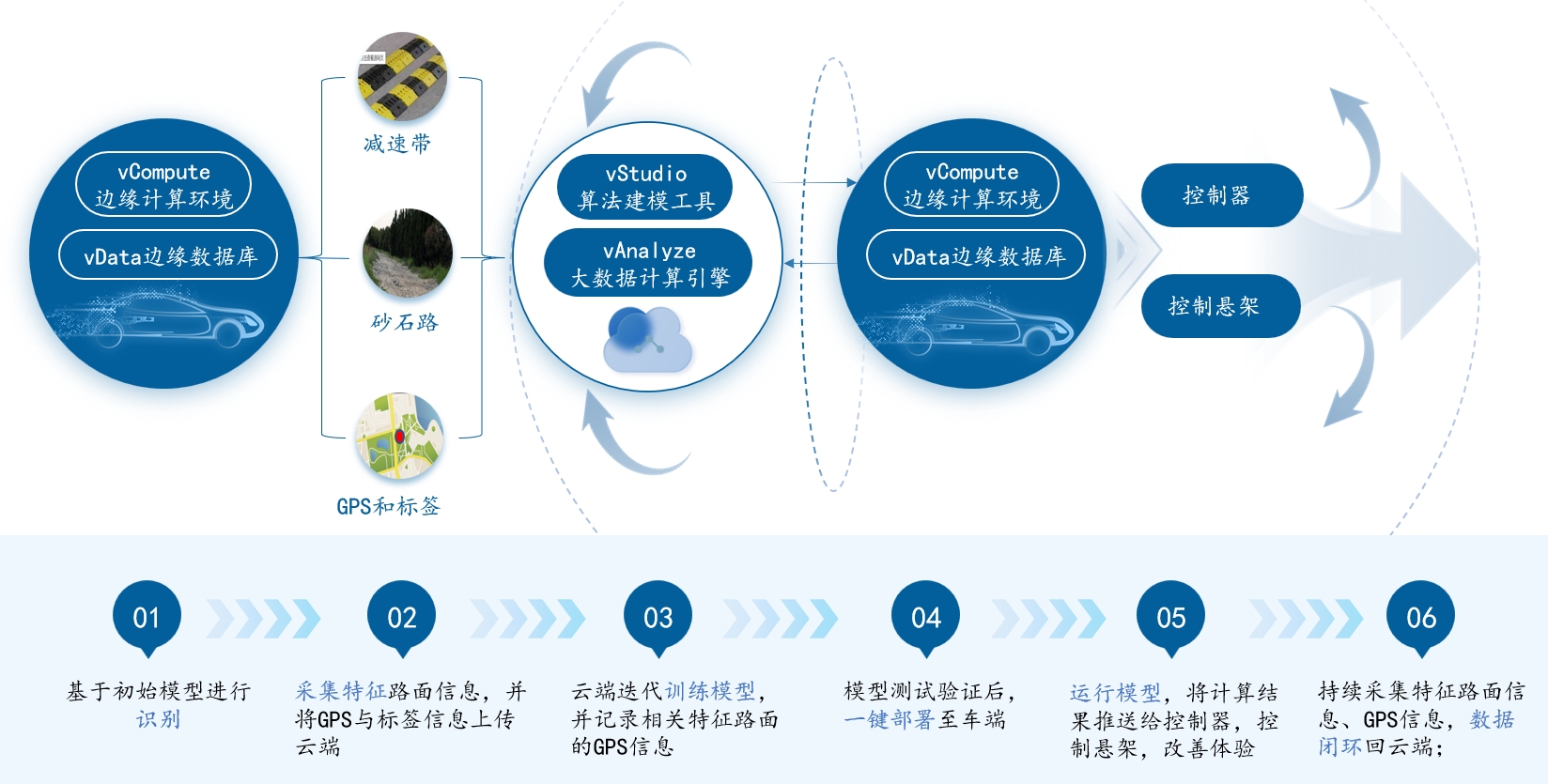 智协慧同EXCEEDDATA解决方案:采集特征路面信息,并将GPS与标签信息上传云端,云端迭代训练模型,验证后一键部署至车端,运行模型,将计算结果推送给控制器,改善体验。